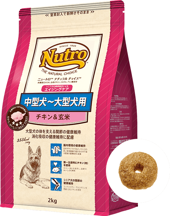 本品は、良質なタンパク質や、玄米などバランスの良い食物繊維の組み合わせで、消化吸収の健康維持に配慮するとともに、体の大きい大型犬の関節の健康維持のためにコンドロイチン・グルコサミンを豊富に含むチキンを使用しています。また、鶏脂やフィッシュオイルなどに含まれる必須脂肪酸であるオメガ3と6の適切なバランスを参考に設計し、皮膚・被毛の健康維持をサポートします。さらに、芯までふやけやすい粒設計を実現しており、シニア犬のニーズに合わせてやわらかくしてあげられます。